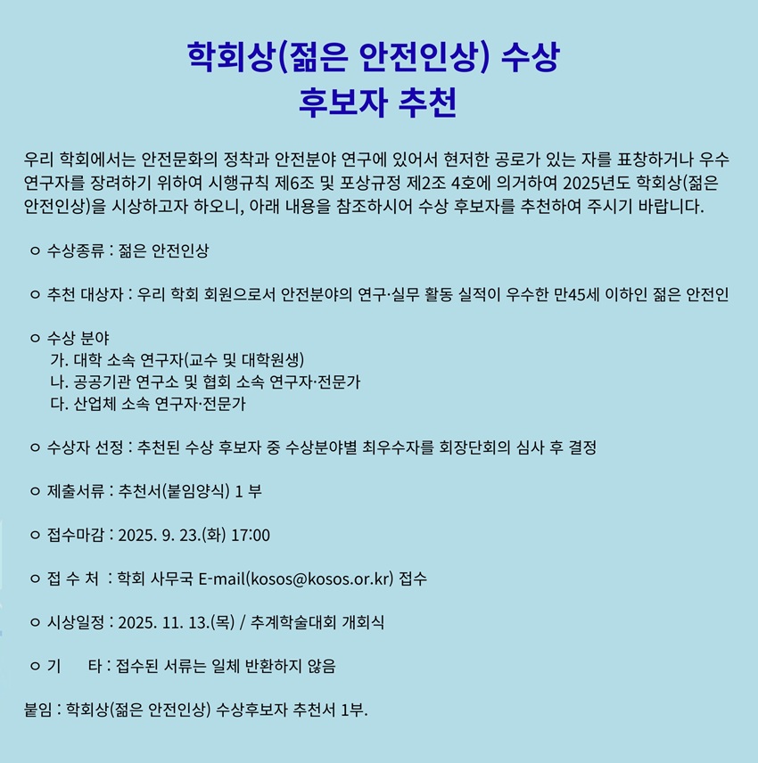 [학회상] 젊은 안전인상 수상후보자 추천_2025. 9. 23.(화) 17:00